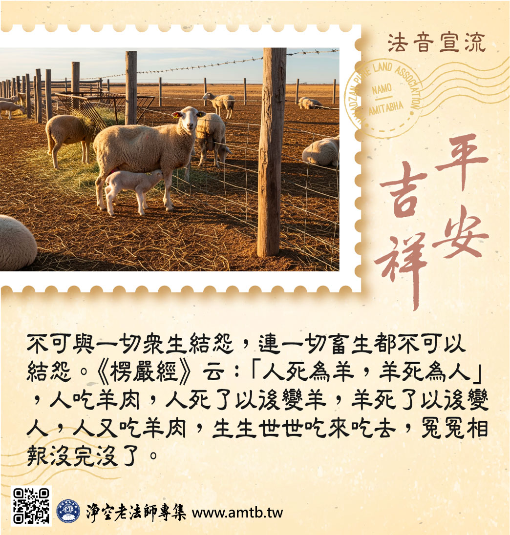 ◎ 不可與一切眾生結怨,連一切畜生都不可以結怨。《楞嚴經》云:「人死為羊,羊死為人。」人吃羊肉,人死了以後變羊,羊死了以後變人,人又吃羊肉,生生世世吃來吃去,冤冤相報沒完沒了。