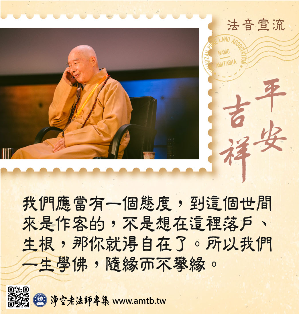 我們應當有一個態度,到這個世間來是作客的,不是想在這裡落戶、生根,那你就得自在了。所以我們一生學佛,隨緣而不攀緣。(990413早餐)