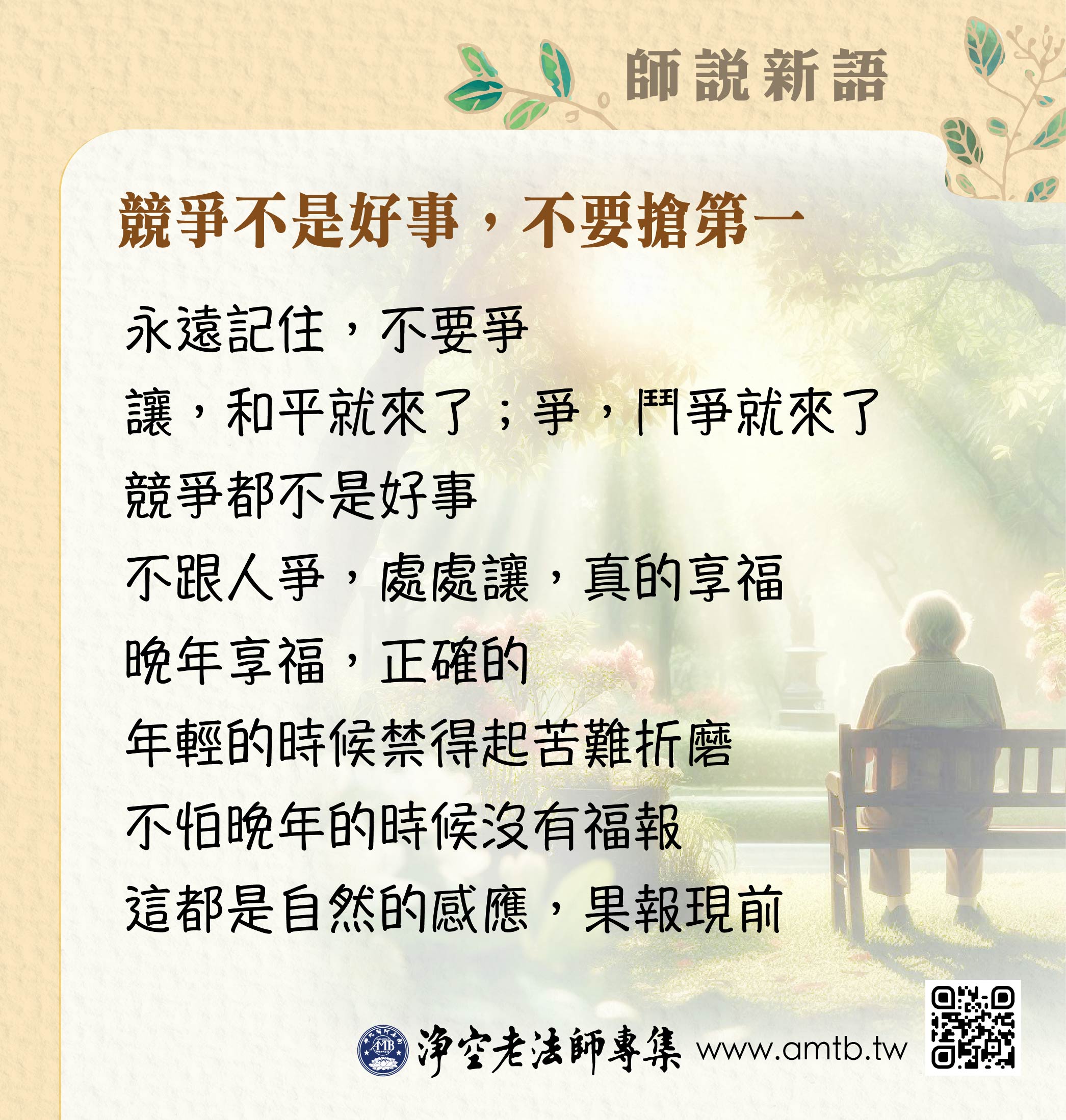 不爭,你們要爭的人請你自己去爭去,我不跟你爭,我退到最後。我只要年年升級,我就很滿意了。這個於以後學佛有很大的幫助。不跟人爭,處處讓,真的享福,晚年享福,正確的。年輕的時候禁得起苦難折磨,不怕。晚年的時候沒有福報,那真可憐,沒有人照顧。這都是自然的感應,果報現前給大家看。幹什麼事情都順利,好!