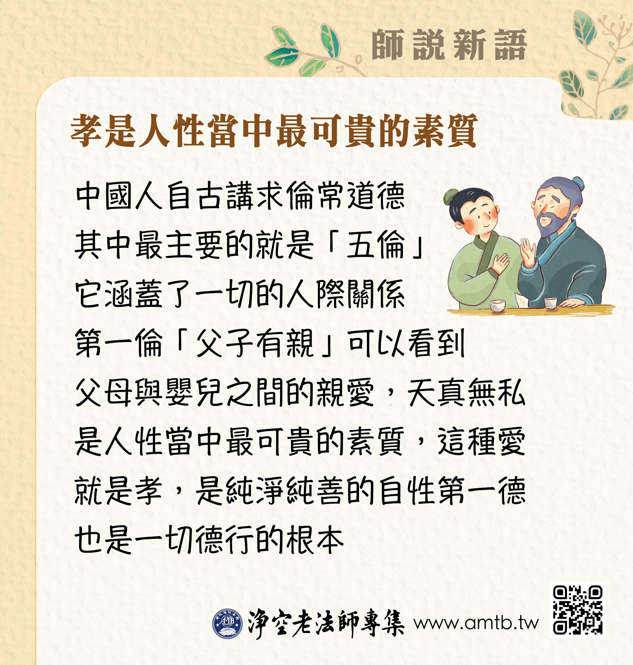 中國人自古講求倫常道德,其中最主要的就是「五倫」。五倫是五種人際關係,它涵蓋了一切的人際關係。五倫當中第一倫就是「父子有親」,父母與子女之間的親愛是天性的、是自然的。