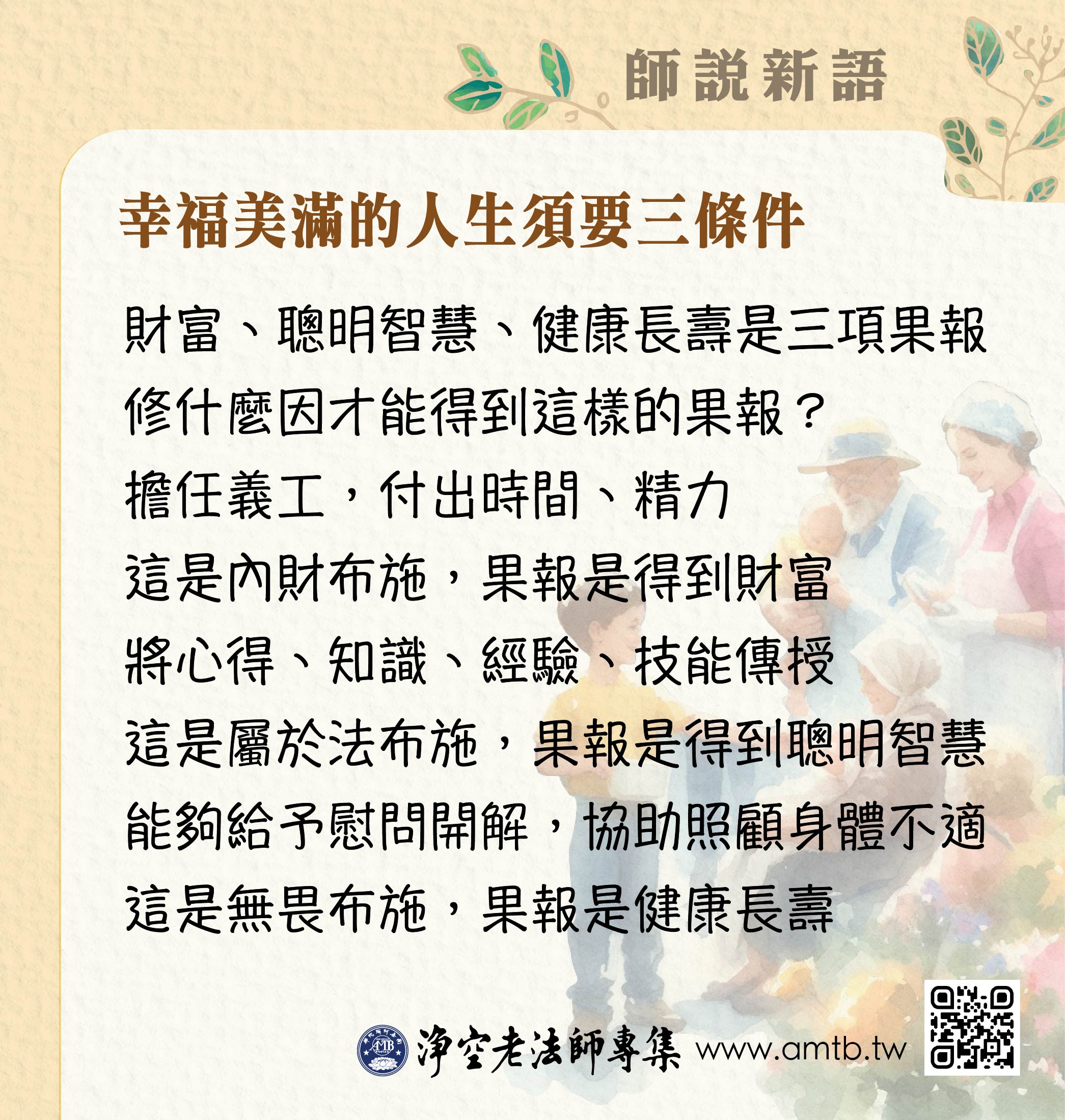 我們說一個幸福美滿的人生必須具備三個條件:財富、聰明智慧、健康長壽。這三項是果報,修什麼因才能得到這樣的果報?那就是要行「財、法、無畏」三種布施。